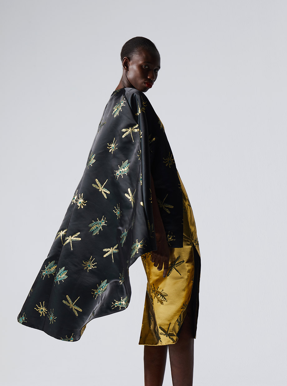 Como una mariposa que despierta de su encierro de seda, estos diseños se materializan sobre delicados rasos poblados de libélulas doradas, Jacquard negros de inspiración iconoclasta, tafetanes y moarés rojo intenso como atardeceres de verano y gasas de filamentos metálicos brillantes como la luz que se cuela entre los viñedos.