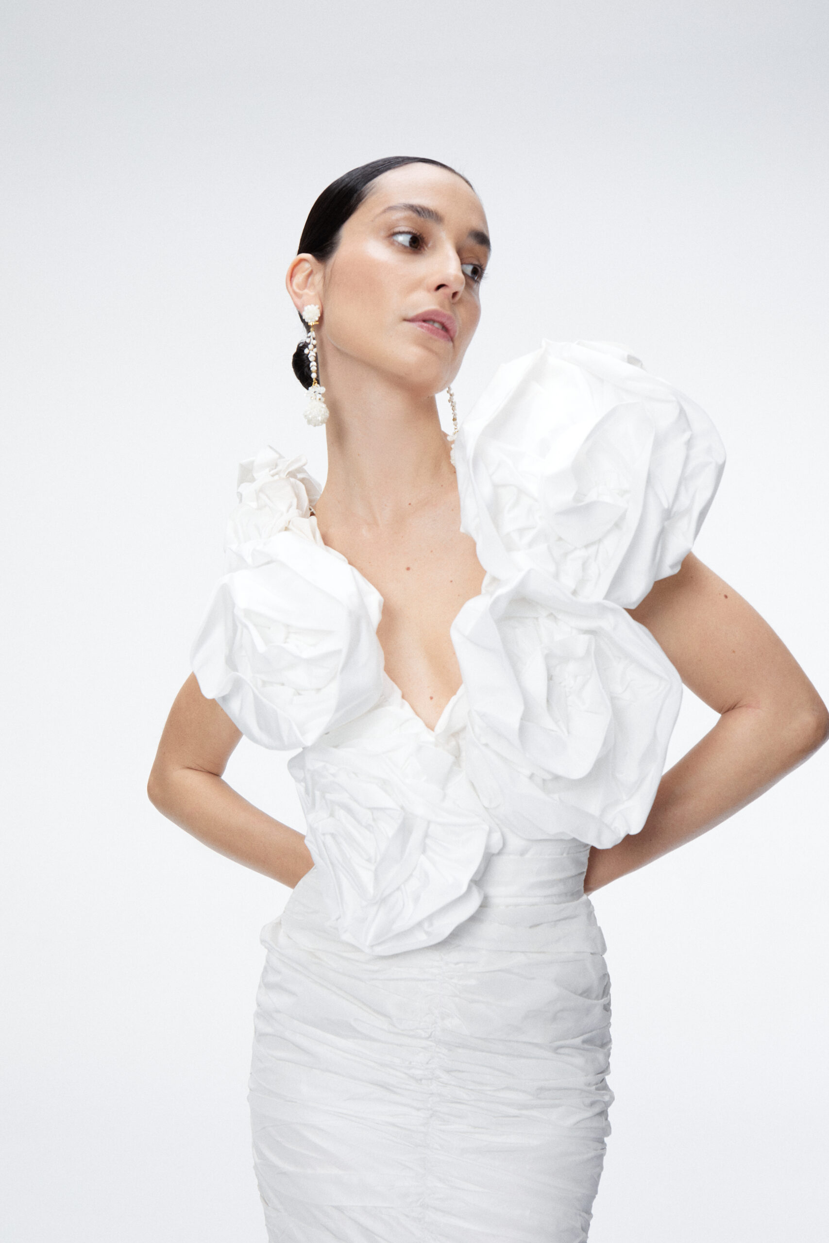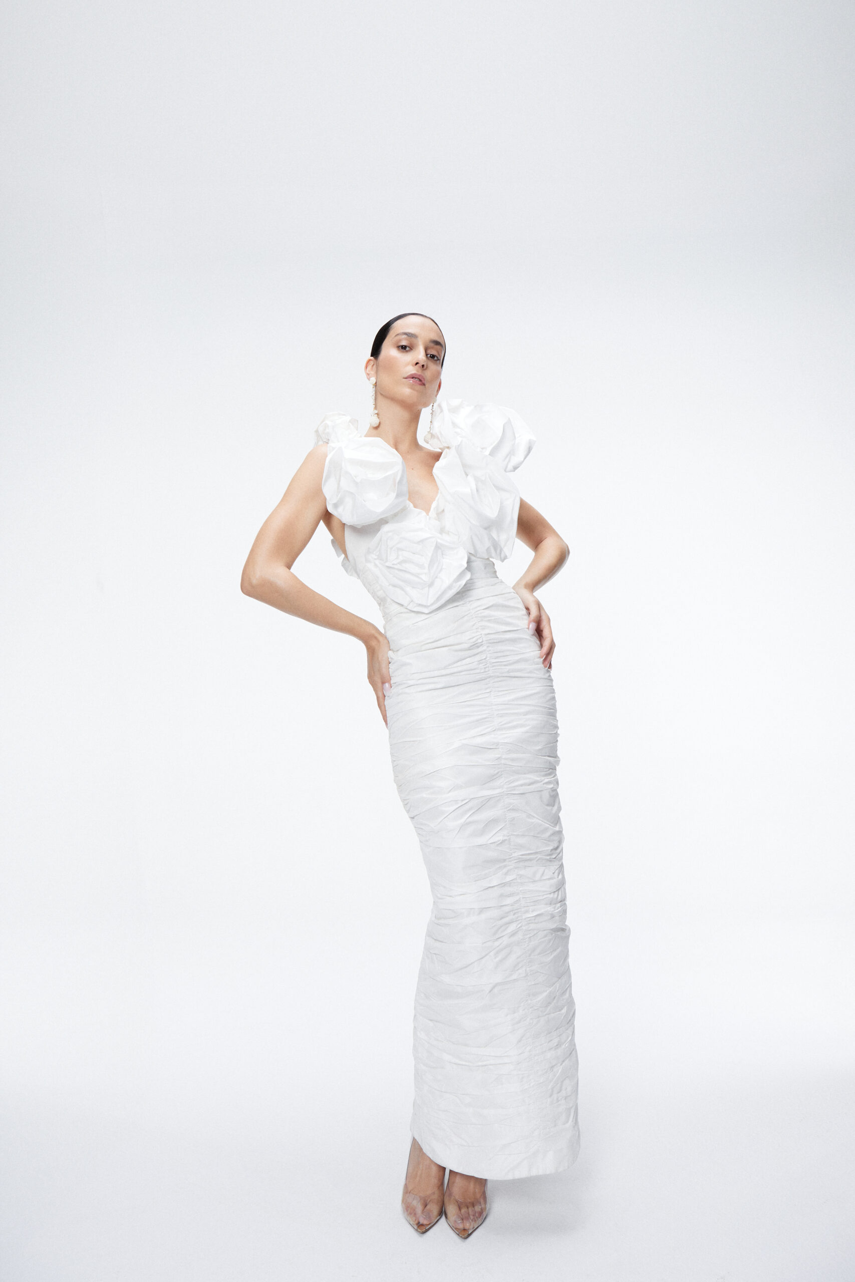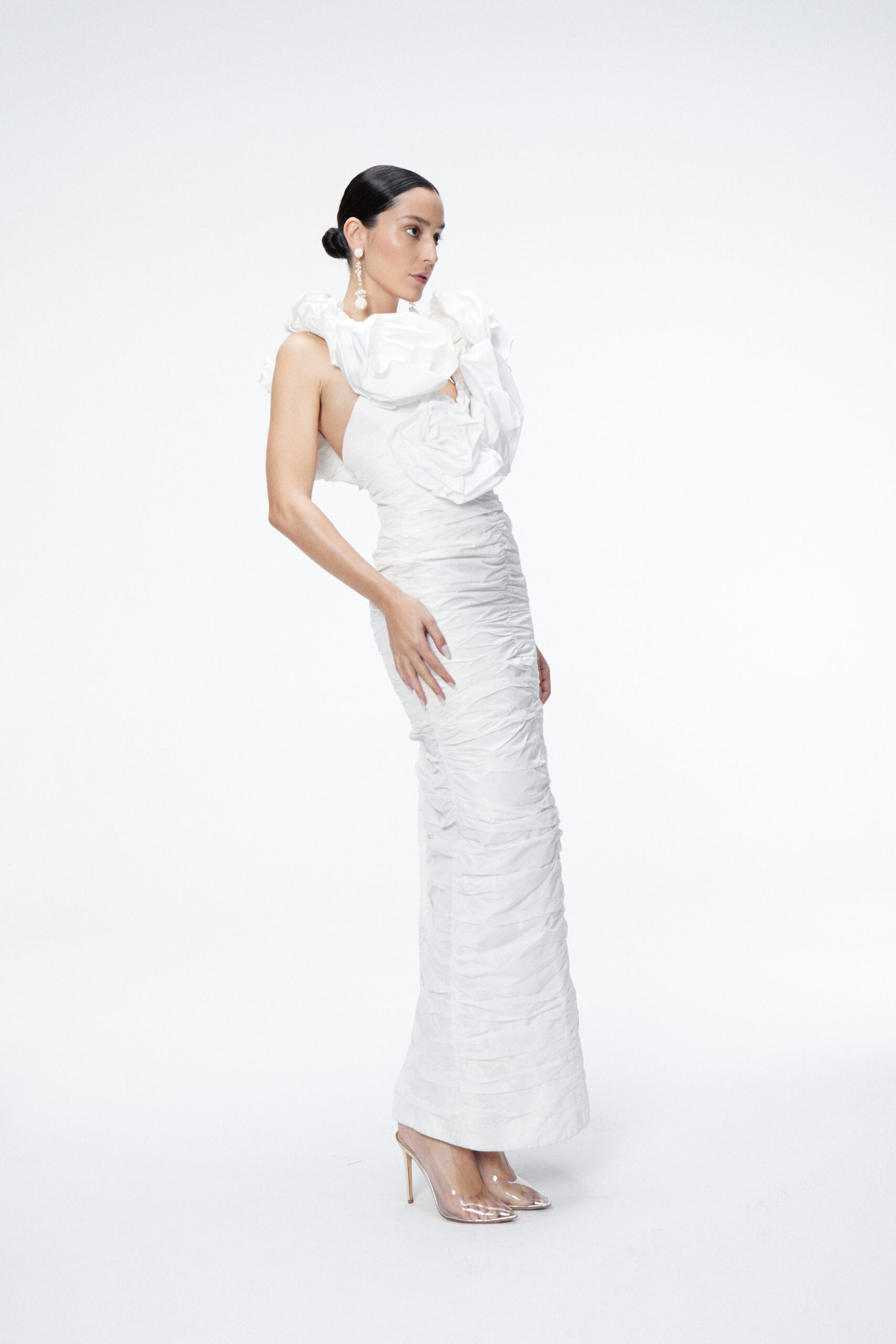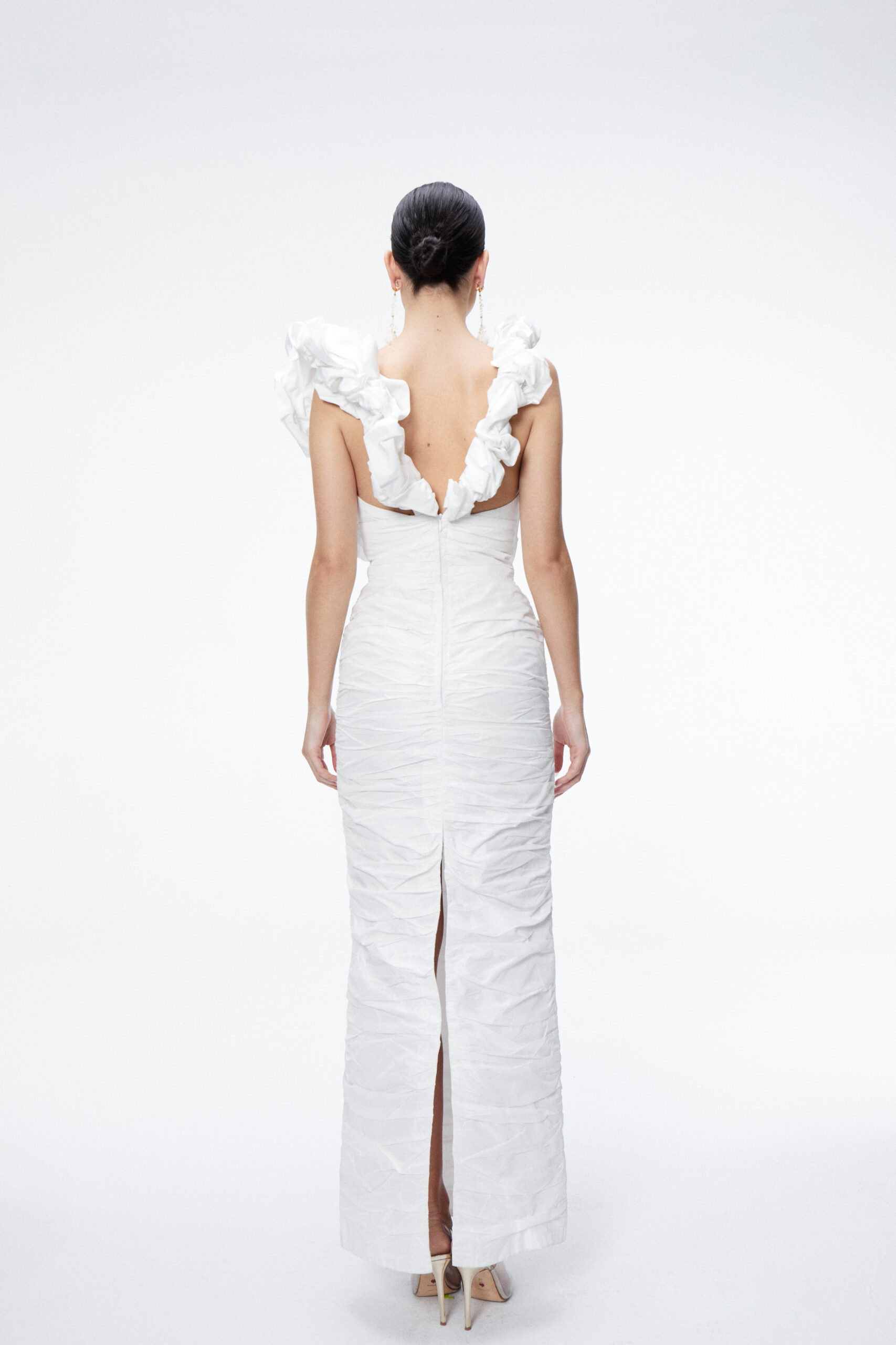 Vestido de tafeta drapeado con escote en uve, con grandes tirantes y maxi flores que terminan con otro escote en la espalda.