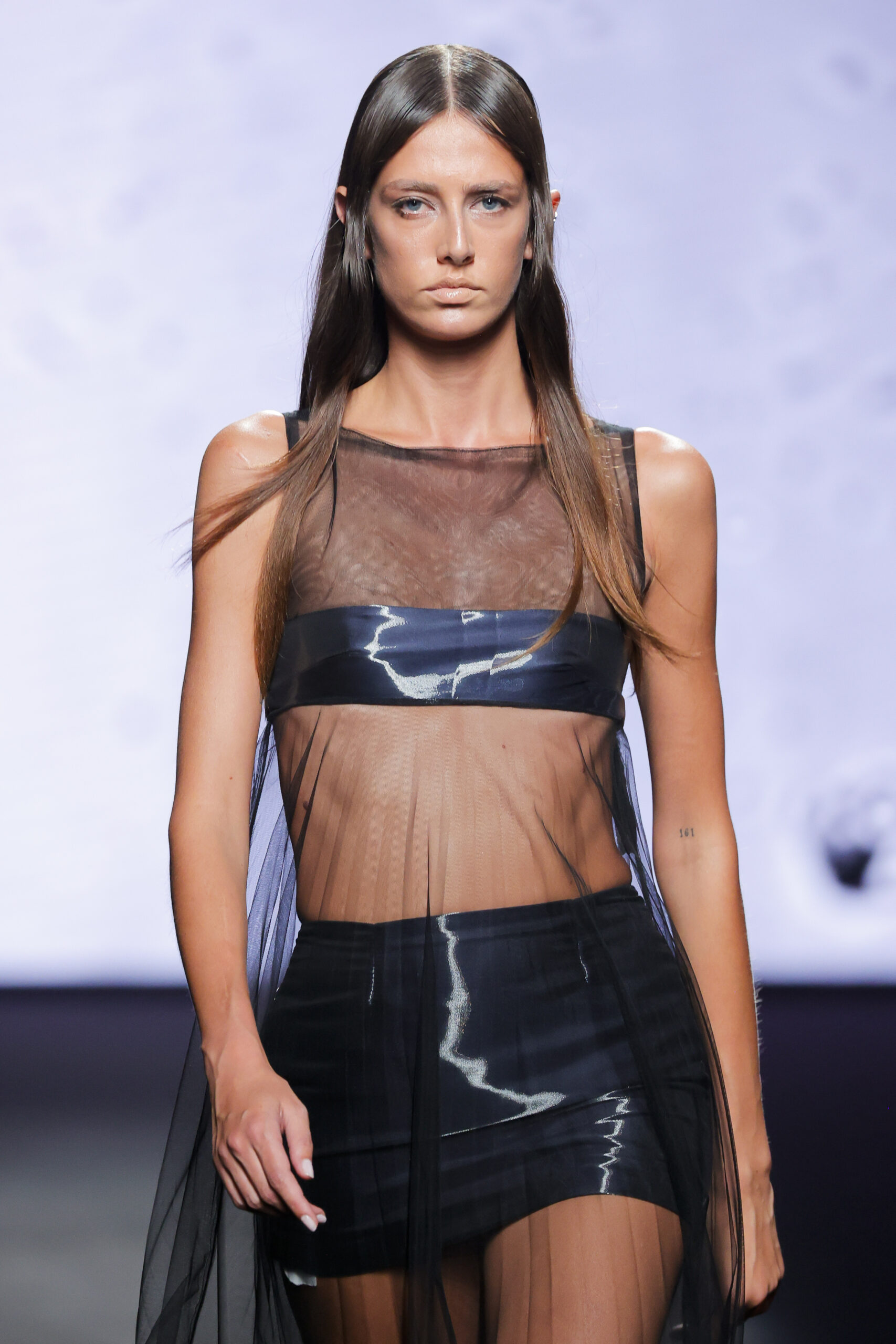 Conjunto de mini top y mini falda en tejido tecnológico efecto plastificado y túnica de tul plisado soleil.